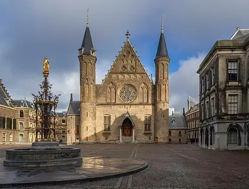 In the center of the oldest quarter of The Hague is the 13th-century Binnenhof (Inner Court) with its medieval-style turrets. Now home to the ruling aristocracy and the Dutch Parliament, the complex encompasses many significant buildings and landmarks including the Rolzaal courthouse that dates back to 1511, the Lairessezaal where 17th-century paintings by Lairesse are kept, and the First Chamber with its painted medallions and portrait of King William II.