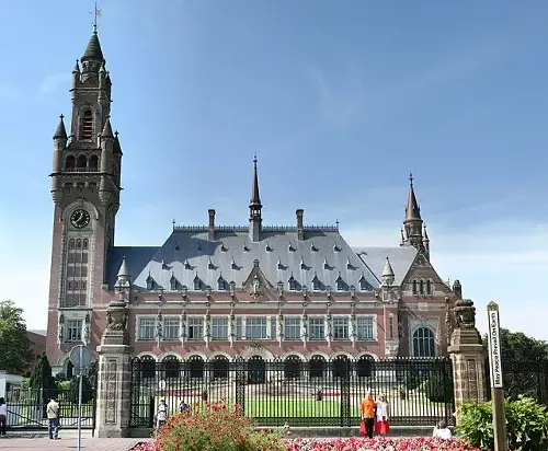 The Peace Palace is home to the International Criminal Court, the Academy of International Law, and a library of international law. Its interior décor is an amalgamation of different national cultures, with marble from Italy, wood paneling from Brazil and the United States, and iron railing from Germany.